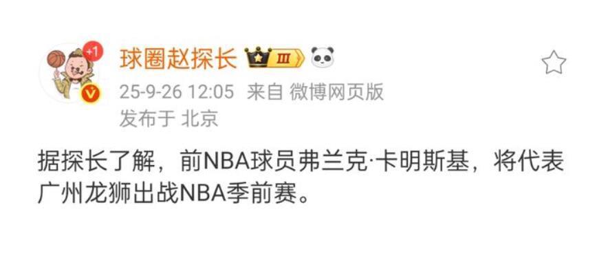 广州龙狮队方面今年夏天通过交易送走了崔永熙和焦泊乔2名主力球员,年轻有潜力的球员于米提也被送往山西队,但是他们并没有摆烂,而是一直有想要冲击季后赛的想法。根据消息称广州龙狮队在参加NBA季前赛的时候将会试训大外援弗兰克-卡明斯基,他是NBA2015年首轮第9顺位秀,身高2米13,臂展2米11;最近两年卡明斯基效力于塞尔维亚联赛和猛龙队下属的发展联盟球队。