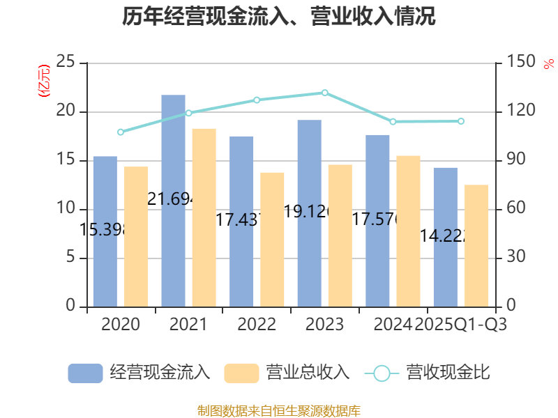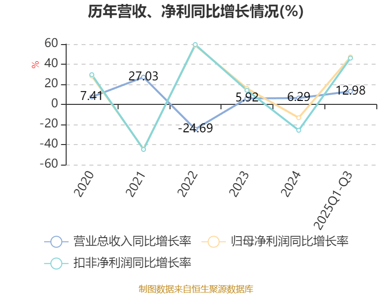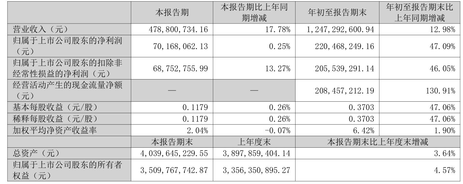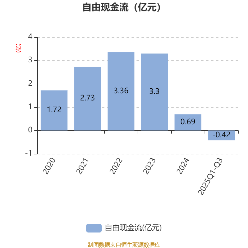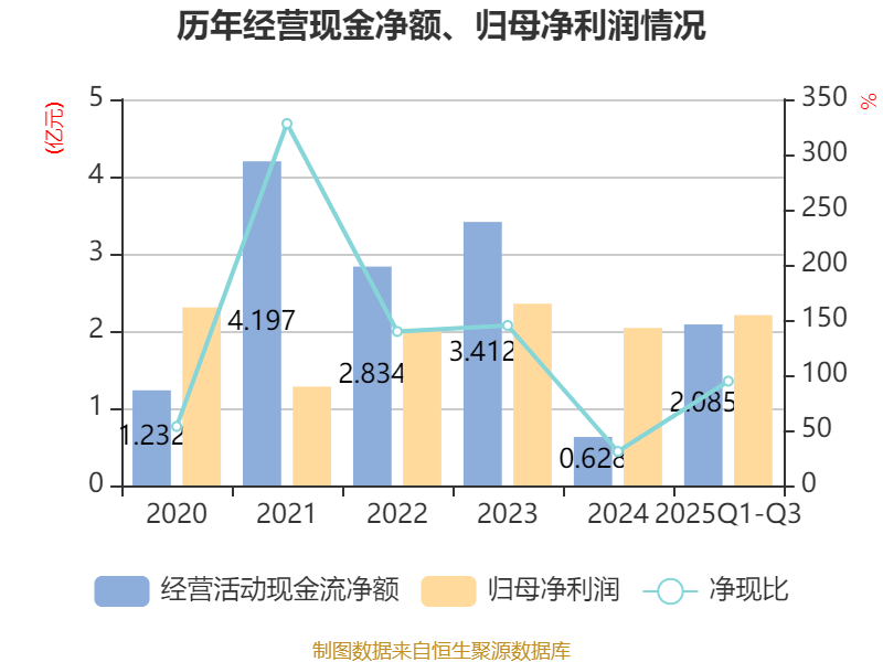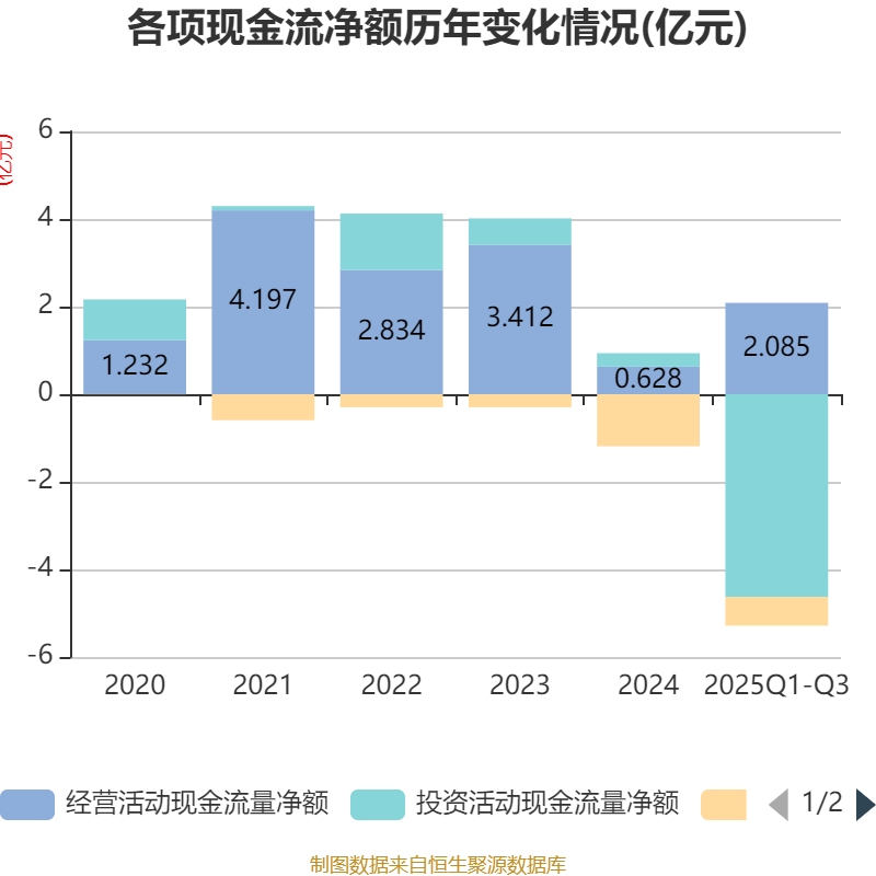 2025年前三季度,公司经营活动现金流净额为2.08亿元,同比增长130.91%;筹资活动现金流净额-6548.74万元,同比增加1951.69万元;投资活动现金流净额-4.63亿元,上年同期为-597.78万元。